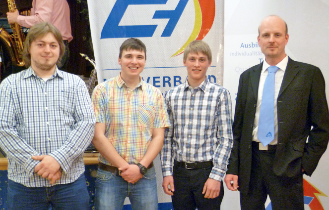 Die drei Hammer-Azubis, hier mit Ausbildungsmeister Michael Huber, haben erfolgreich die Gesellenprüfung bestanden. Christian Ecker (Dritter v. l.) wurde als Drittbester geehrt.