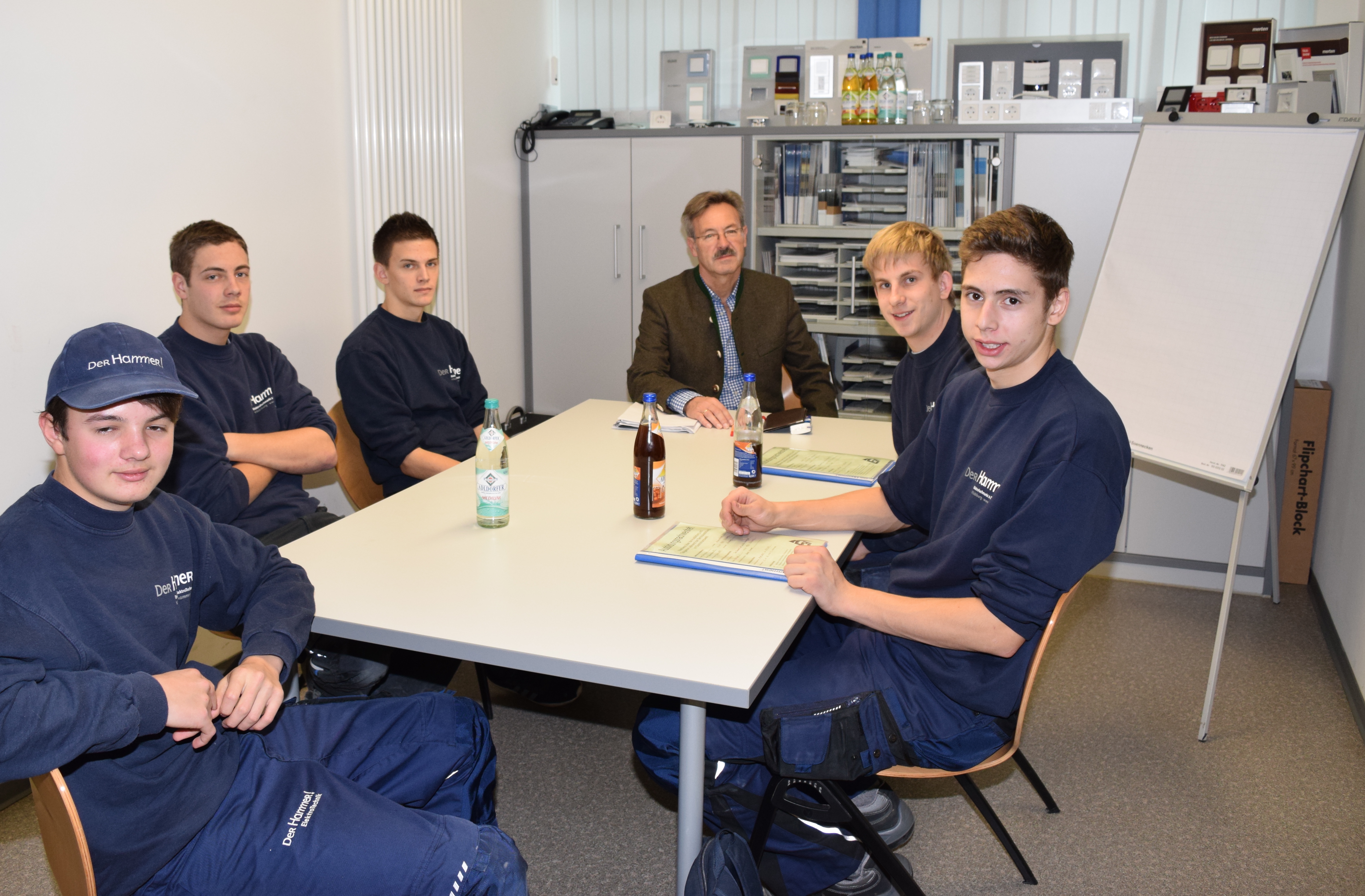 Ausbildungscoach Erwin Wiesmeier brachte den neuen Azubis die Selbstmotivation zur Hammer Qualität nahe während die höheren Lehrjahre ihre Fragen zur Messtechnik an einen Techniker stellen konnten und E-Technik Messungen durchführten.