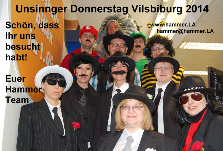 ![]() Unsinniger Donnerstag 2014 in Vilsbiburg ... beim Hammer war einiges los! Das Hammer-Team kann auch richtig feiern und am "Nationalfeiertag Vilsbiburgs" war beim Hammer einiges los! Der ElektroFachmarkt öffnete für alle Narren und "Verrückten" das Geschäft und präsentierte sich einmal mehr von einer ganz anderen Seite.